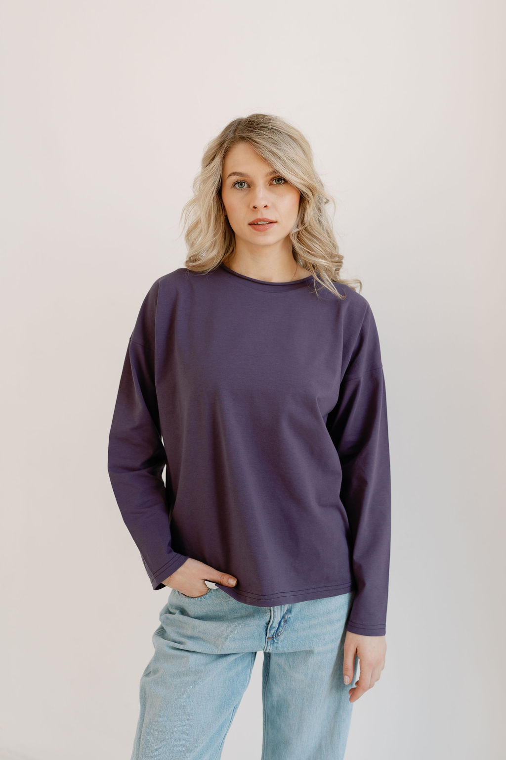 Longsleeve damski z niezwykle miękkiej i delikatnej bawełny w odcieniu stonowanej śliwki. Krój prosty, swobodny i surowe wykończenie przy szyi – bardzo wygodny, uniwersalny i komfortowy.